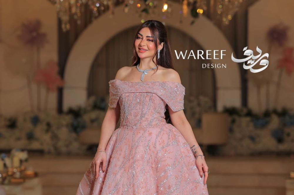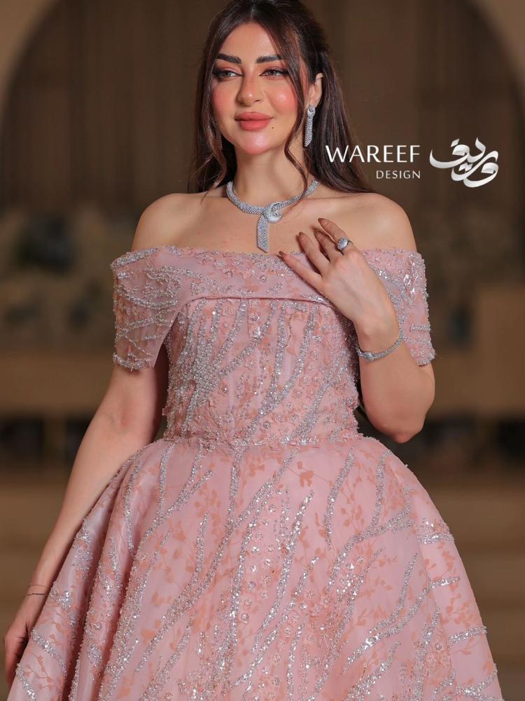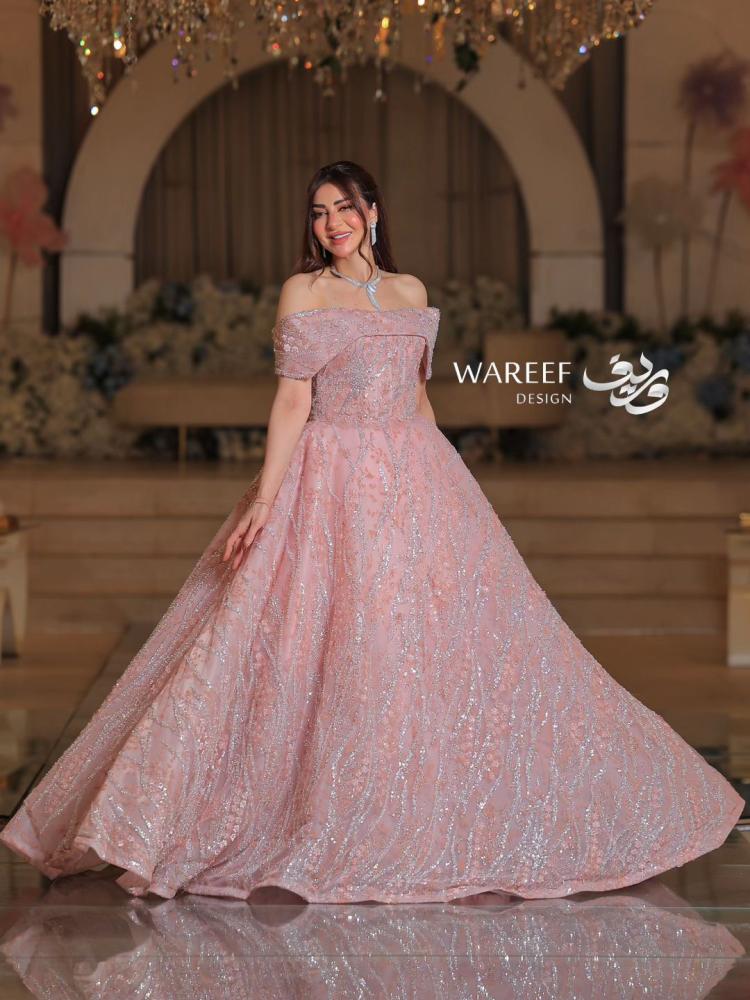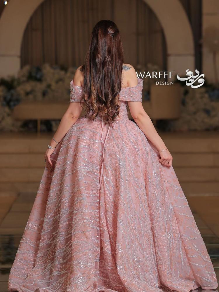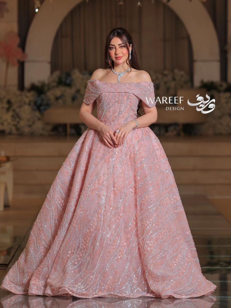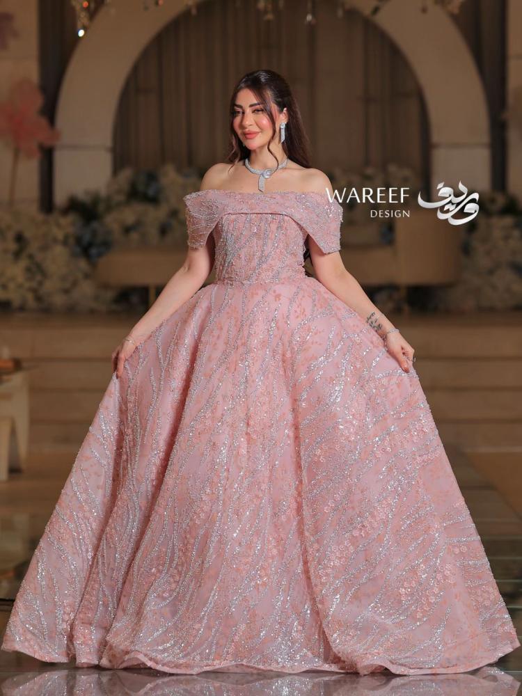 فستان ملكة فخم بتصميم فريد باللون الوردي الفاتح مزين بتطريز كامل