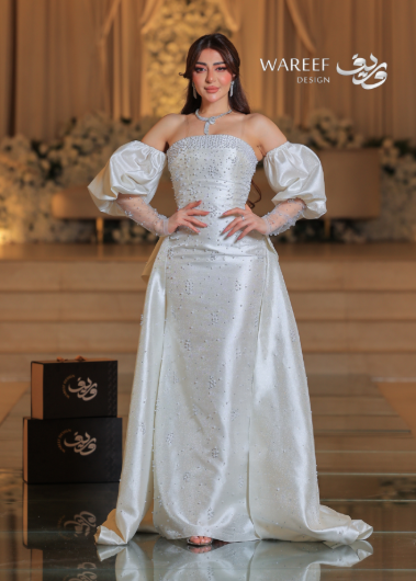 مصنوع من قماش الميكادو الفاخر المعروف بملمسه الحريري ولمعانه الهادئ، مما يضيف للفستان بريقًا رقيقًا يلفت الأنظار دون مبالغة. اللون الأبيض النقي يعكس الصفاء والنقاء، ويمنح الفستان طابعًا كلاسيكيًا خالدًا يناسب جميع ألوان البشرة.