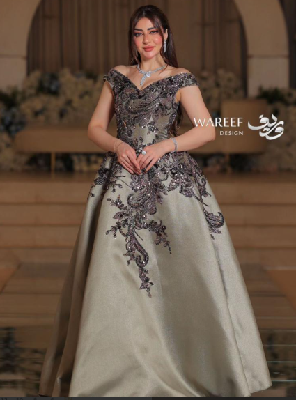 الفستان يتبع قصة A-line واسعة تبدأ بصدر ضيق وأكتاف مكشوفة بأسلوب أوف شولدر، ما يضفي لمسة أنثوية جذابة تعزز من بروز الرقبة والكتفين بأسلوب راقٍ وعصري. هذه القصة تعطي حرية حركة وراحة مع الحفاظ على شكل أنيق يليق بالسهرات والمناسبات الخاصة.