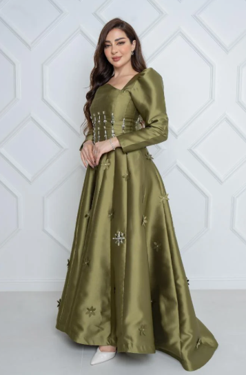 فستان سهرة ميكانو أنيق باللون الزيتي يجمع بين الأناقة والدفء، بقصة مريحة تبرز جمال القوام بطريقة راقية ومناسبة لمختلف المناسبات، من السهرات الخاصة إلى اللقاءات اليومية.