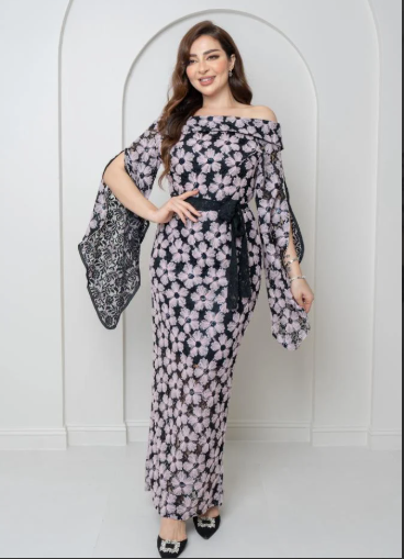 تصميم ضيق بالكامل مع ياقة أوف شولدر، يبرز جمال الكتفين والرقبة، مع ذيل جانبي طويل يضيف حركة وأناقة.