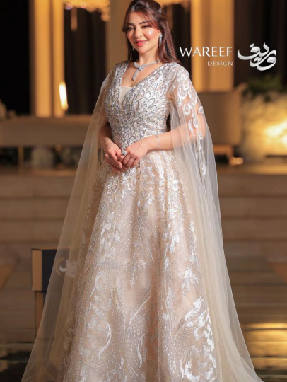 يأتي هذا الـ فستان سهرة البيج الساحر بتصميم أنثوي راقٍ يجمع بين قصة A-Line الواسعة والصدر الضيق لإبراز الخصر وتعزيز جمال القوام. تضيف الأكمام الطويلة والواسعة لمسة ملكية فاخرة، بينما يبرز التطريز اللامع اليدوي تألقكِ في كل مناسبة.