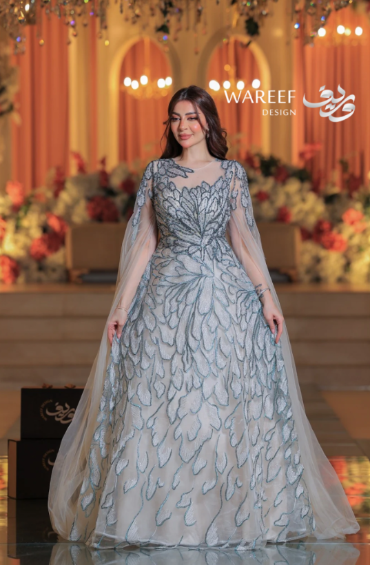 كل التفاصيل في فستان طويل بتطريز يدوي تيفاني بتصميم أوراق متداخلة مع كاب شفاف ملكي تمنحك مظهرًا براقًا وفريدًا بمجرد ارتدائه، إذ إنه من فساتين سهرة مع كاب التي: